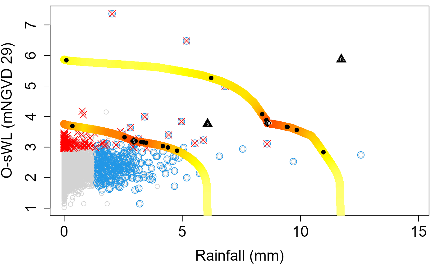 contoured according to their relative probability of occurrence on the basis of the sample from the two joint distributions, the "most likely" design event (black diamond), and design event under the assumption of full dependence (black triangle) are also shown in the plot. The function also returns a list comprising the design events assuming full dependence "FullDependence"