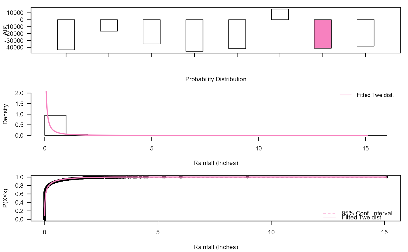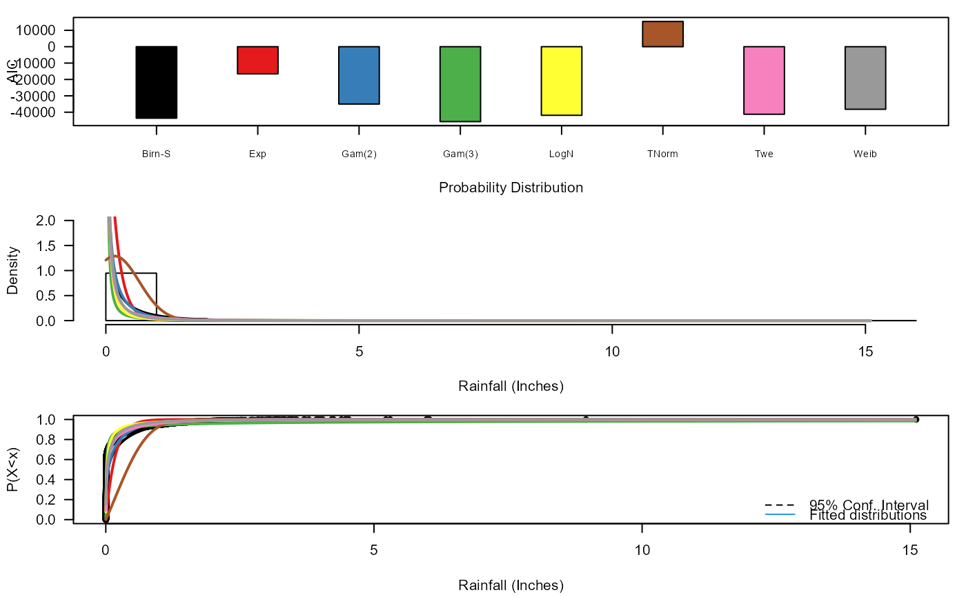 Panel consisting of three plots. Upper plot: Plot depicting the AIC of the eight fitted distributions. Middle plot: Probability Density Functions (PDFs) of the fitted distributions superimposed on a histogram of the data. Lower plot: Cumulative Distribution Functions (CDFs) of the fitted distributions overlaid on a plot of the empirical CDF.