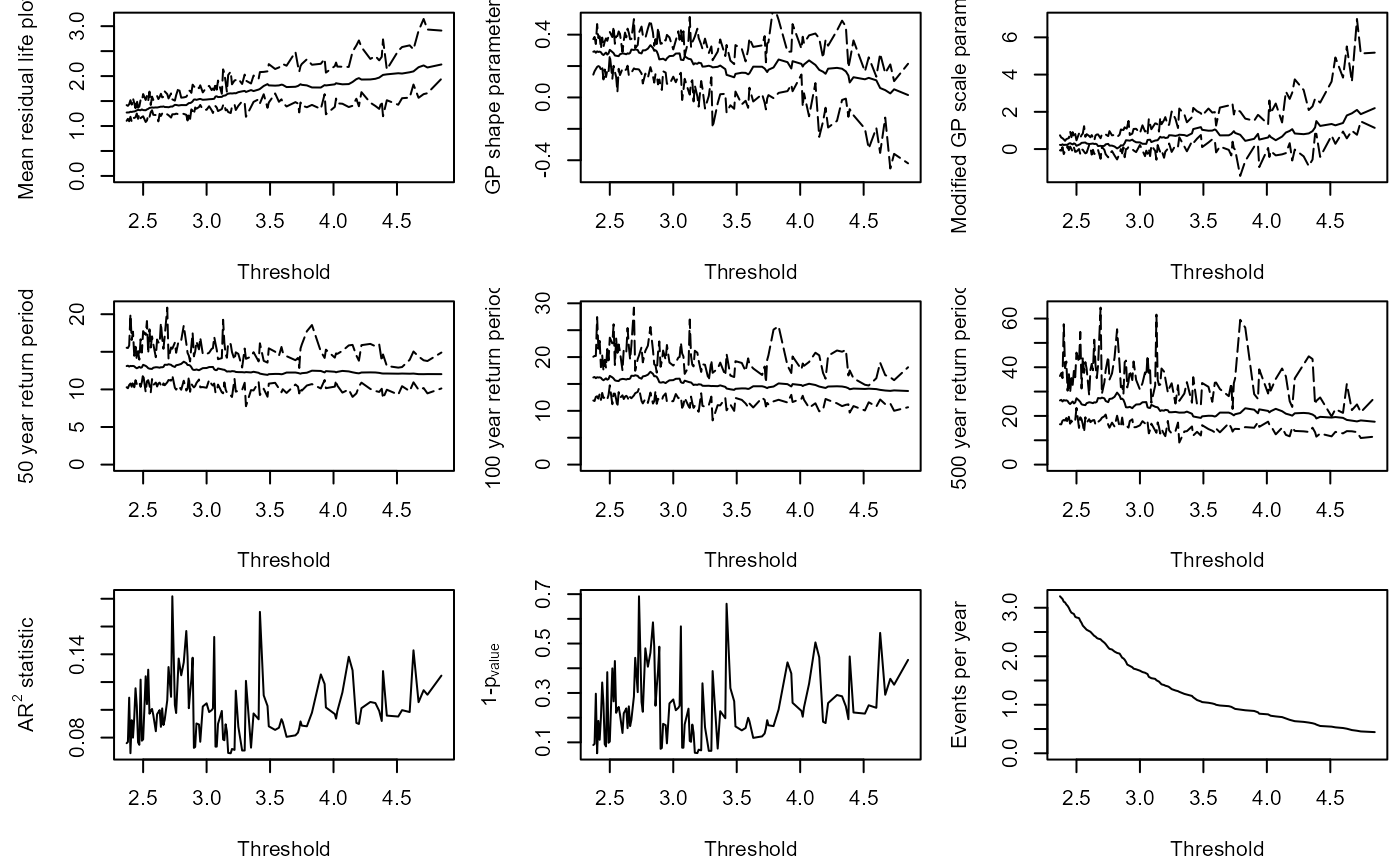 To interpret the graphical output. Top row: The GPD exhibits certain threshold stability properties. The guiding principle for threshold choice is to find the lowest value of the threshold such that the parameter estimates stabilize to a constant value which is sustained at all higher thresholds, once the sample uncertainty has been accounted for (typically assessed by pointwise uncertainty intervals). Mean residual life plot (left). If the GPD is a valid model for excesses above a threshold then the mean of these excesses will be a linear function of the threshold. We therefore select the lowest threshold where there is a linear trend in the mean residual life plot. Parameter stability plots for the shape (center) and scale (right) parameters. If the GPD is a suitable model for a threshold then for all higher thresholds it will also be suitable, with the shape and scale parameters being constant. The lowest threshold - to reduce the associated uncertainty - at which the parameter estimates are stable for all higher thresholds should be selected. Middle row: Return levels estimated from the GPD fitted at various thresholds. Lower row: Right-tail weighted Anderson Darling statistic \(A_R^2\) associated with the GPD fitted using various thresholds. Lower \(A_R^2\) statistic values signify less (quadratic) distance between the empirical distribution and the GPD i.e., GPD is a better fit for these thresholds (left). \(1-p_{value}\) associated with the \(A_R^2\) for each threshold. The \(A_R^2\) goodness of fit tests, tests the null hypothesis that the observations are from a GPD. At smaller \(1-p_{value}\) figure there is less chance of rejecting the null hypothesis i.e., the GPD is more suitable at these thresholds (center). Events per year at each threshold (right).